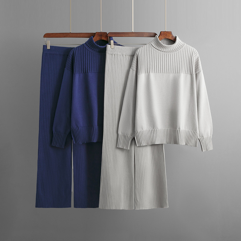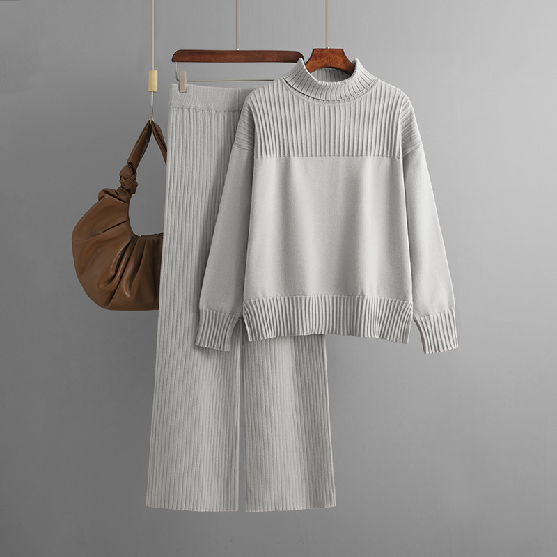 Knitted Pullover Solid Color High Collar Loose Sweater Set